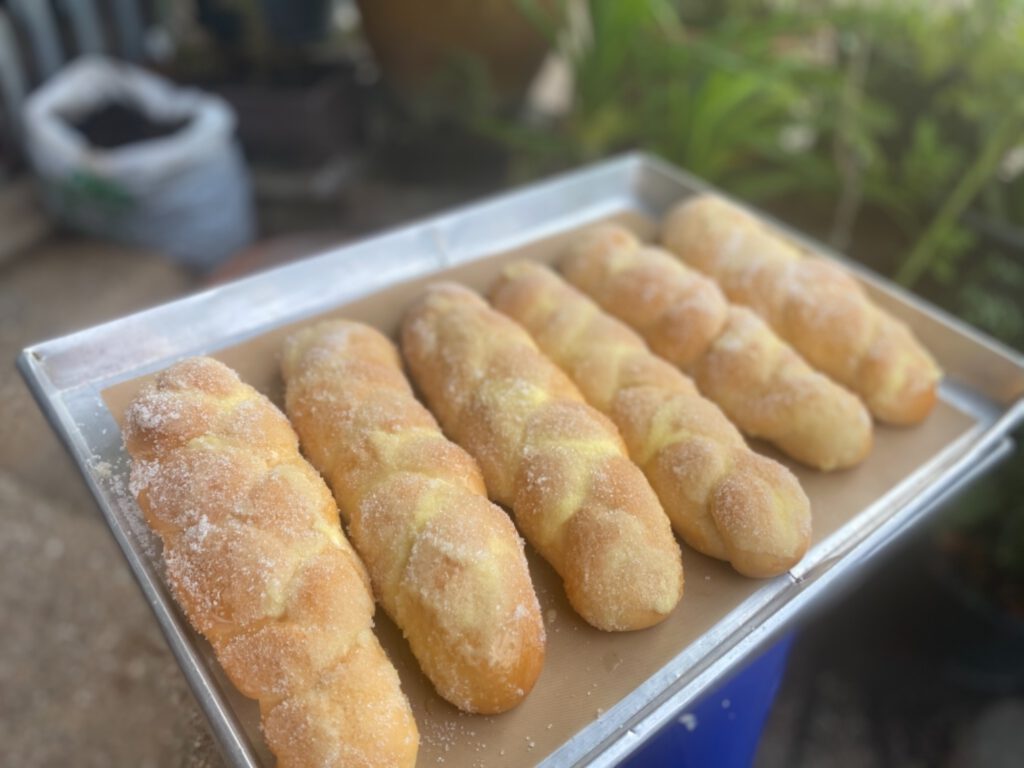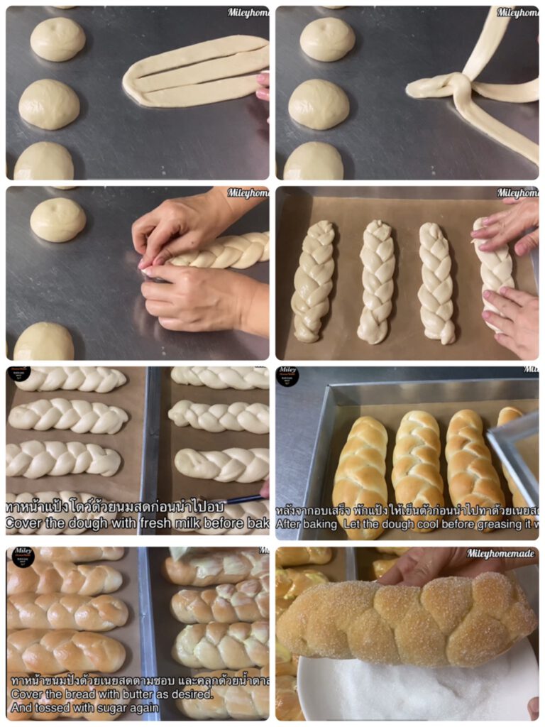 – รี ดแป้งเป็นแผ่นยาว ตัดเป็น 3 เส้น และถักขึ้นรูปขนมปั ง