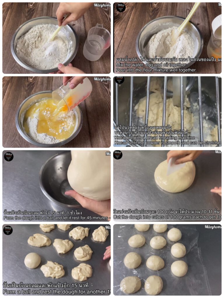 – ตัดแป้งก้อนละ 100 กรัม ปั้นเป็นก้อนกลมและพักแป้งอีก 15 นาที