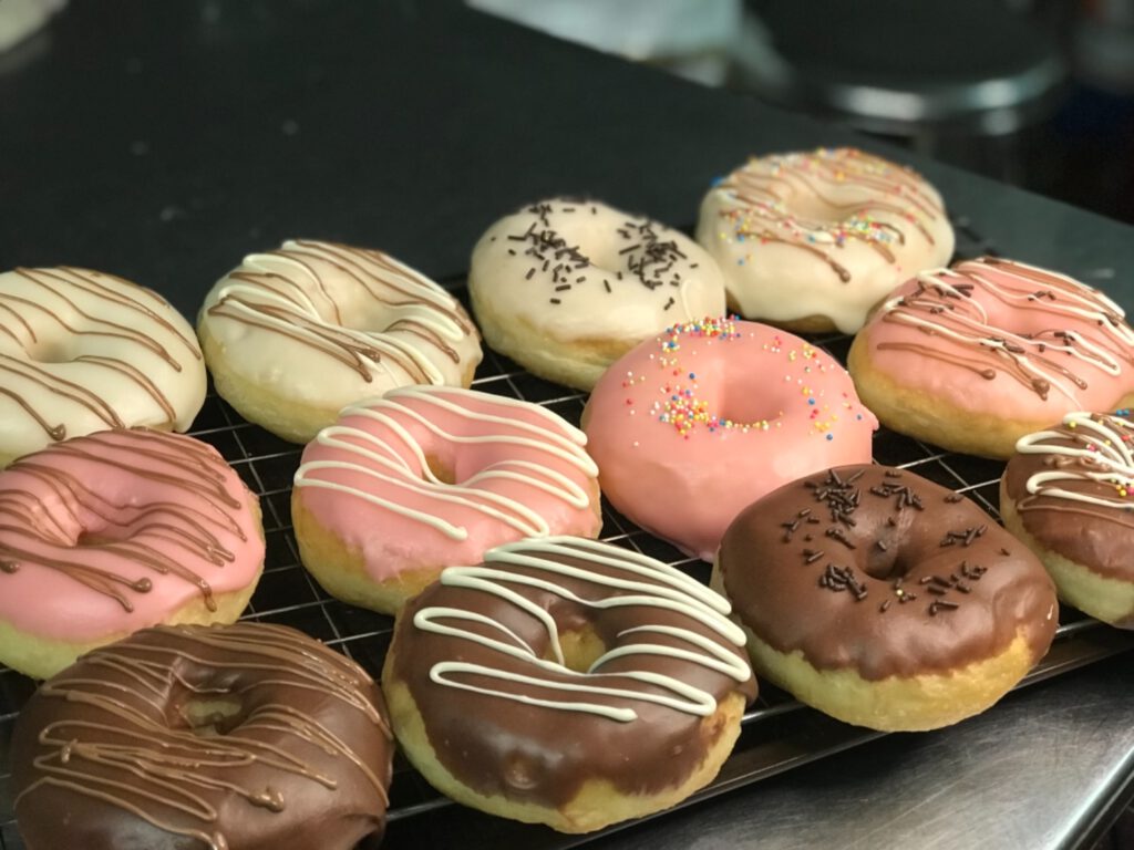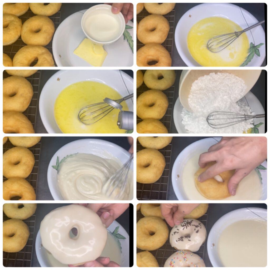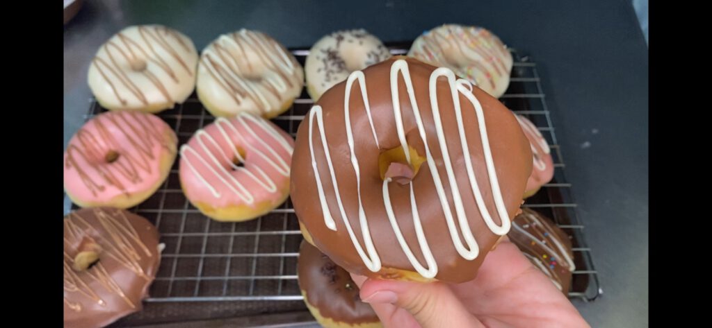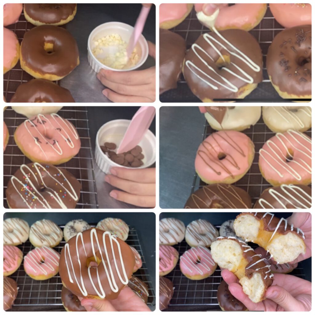 – นำโดนัทลงไปชุบ และตกแต่งหน้าโดนัท