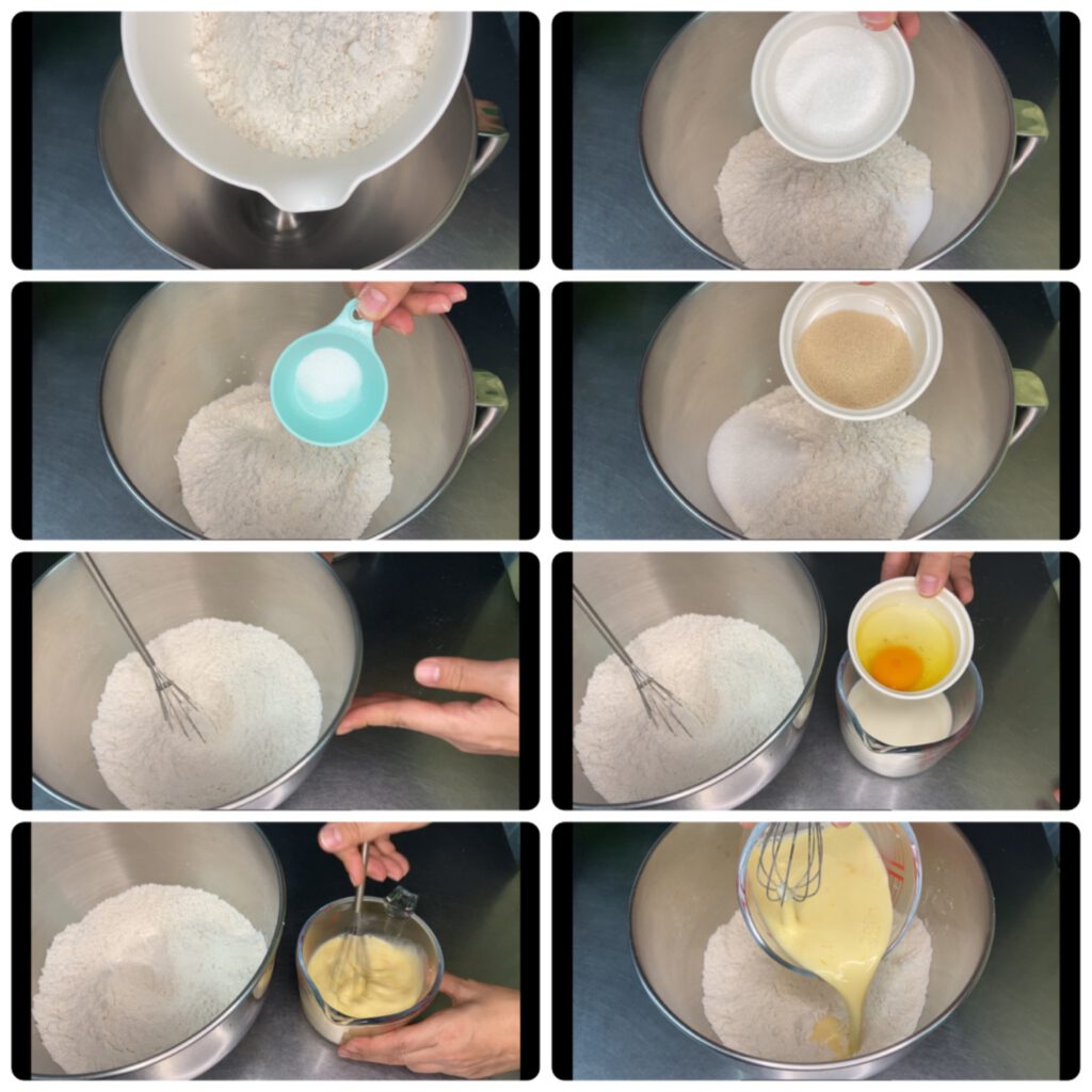 – ผสมแป้ง น้ำตาล เกลือ และยีสต์รวมกัน