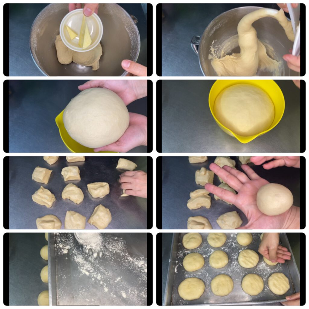 – ปั้นเป็นก้อนกลม เรียงลงบนถาด พักแป้ง 30 นาที โดยกดให้แป้งแบนลง