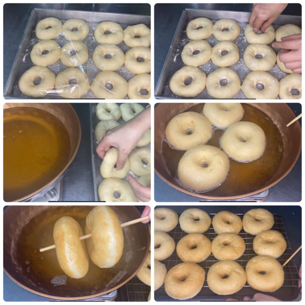 – หลังจากพักแป้ง30 นาทีแล้ว ให้เจาะรูโดนัท และพักแป้งอีก 15 นาทีก่อนนำไปทอด
