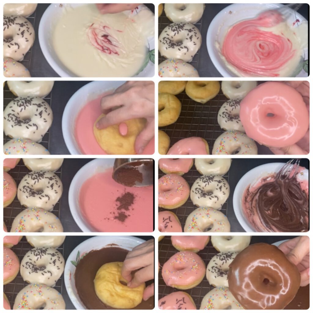 – ถ้าต้องการสีชมพูให้เติมสีชมพูลงไปเล็กน้อย ผสมให้เข้ากัน และนำโดนัทลงชุบ