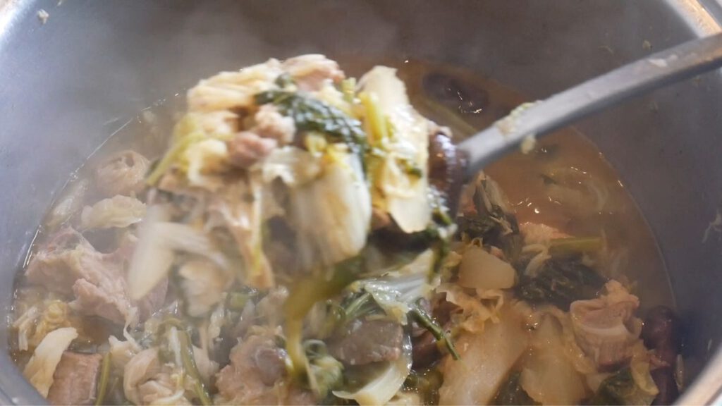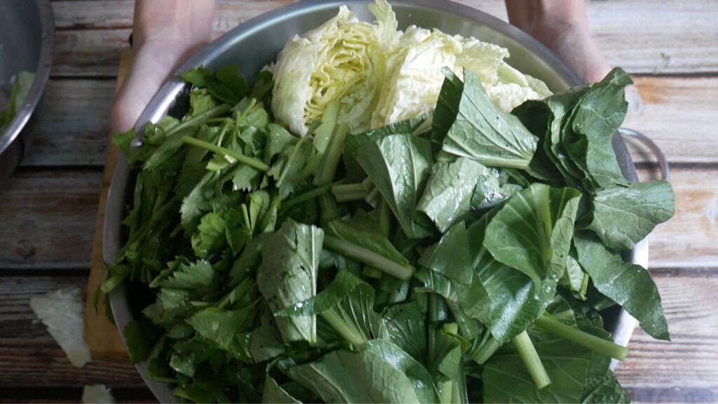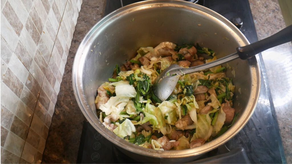 2. เตรียมหั่นผักที่ใช้ในต้มจับฉ่ ายและหั่ นกะดู กหมู