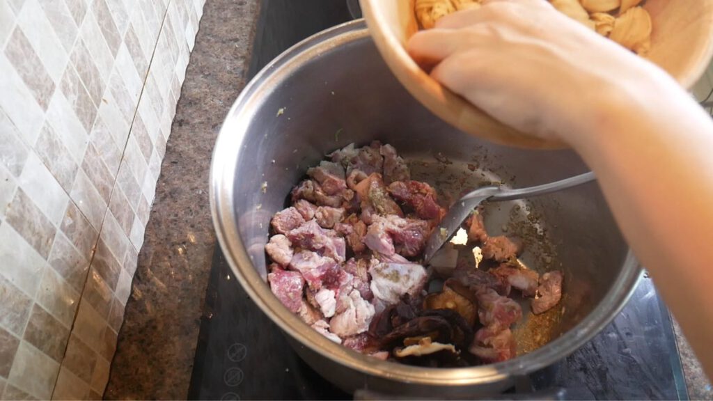 3.ตั้งหม้อหรือกะทะ ใส่น้ำมัน ผัด3 เกลอให้หอมและใส่หมูลงไปผัดให้พอสุ ก และใส่เห็ดหัวหอมลงไปผัดด้วยกัน