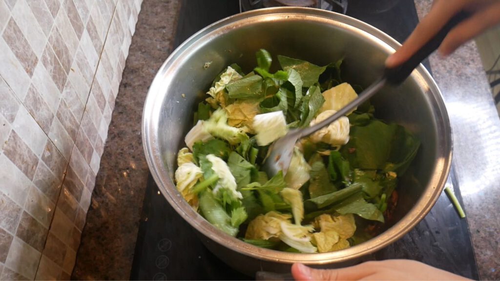 6.ใส่น้ำลงไปให้ท่ ว มผักและต้มจนเ ดื อ ดช้อนฟองออก