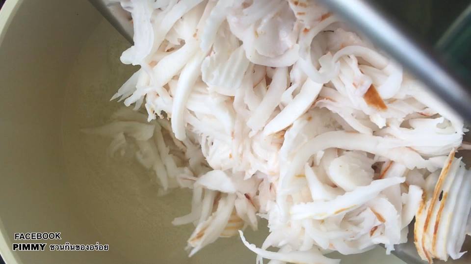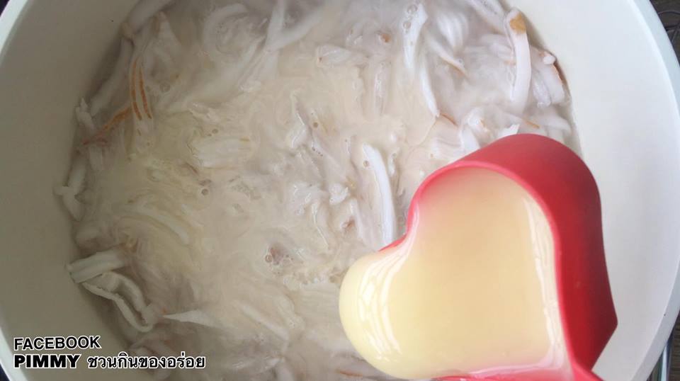 3.พอเ ดื อ ดนิดหน่อยไม่ต้องมาก ก็ไส่เ นื้ อมะพร้าวลงไป