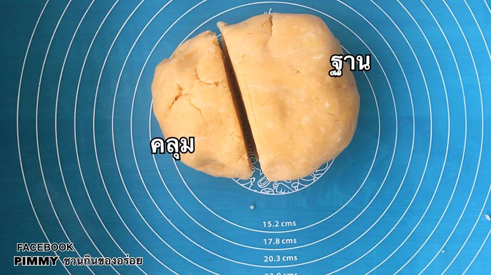 1.แบ่งแป้งเป็น 2 ส่วน 70:30 ส่วนใหญ่ใช้ทำฐาน ส่วนเล็กใช้คลุม