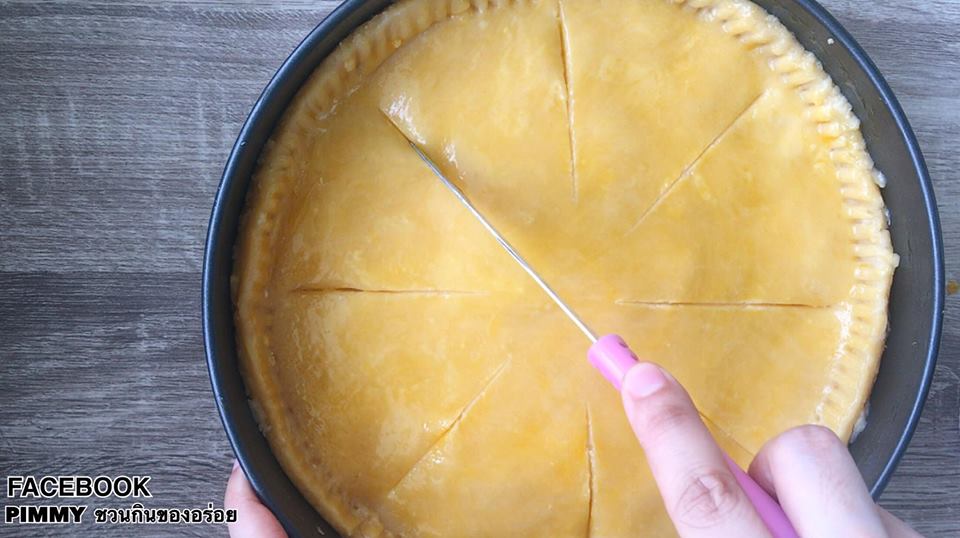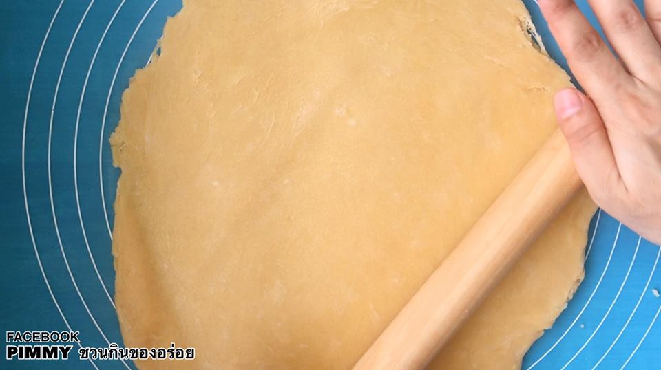 ส่วนเกินแป้งที่ไม่สวยก็ตัดออก ตกแต่งให้สวยงาม แล้วใช้ส้อมกดขอบพาย หรือใครจะทำเหมือนขอบยิ้มพัพก็ได้