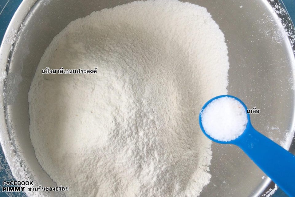 1.ร่อนแป้งรวมกับน้ำตาลไอซิ่ง แล้วผสมเกลือลงไปในแป้ง แล้วคลุกเคล้าให้เข้ากัน