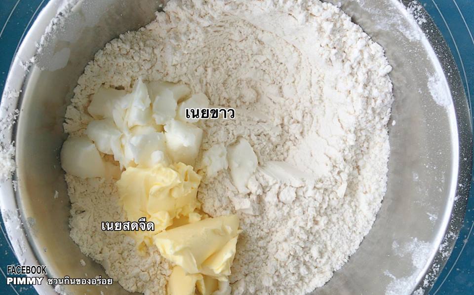 2.ใส่เนยสด + เนยขาว ลงในแป้ง