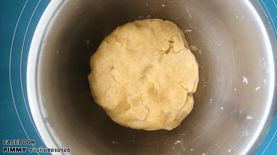 พอใช้ส้อมหรือพายตะล่อมพอจับกันแล้วก็ใช้มือกดๆนวดๆเบาๆนิดหน่อย ไม่ต้องนวดหนักนวดนาน เอาแค่แป้งเข้ากันเป็นก้อน