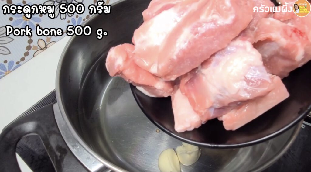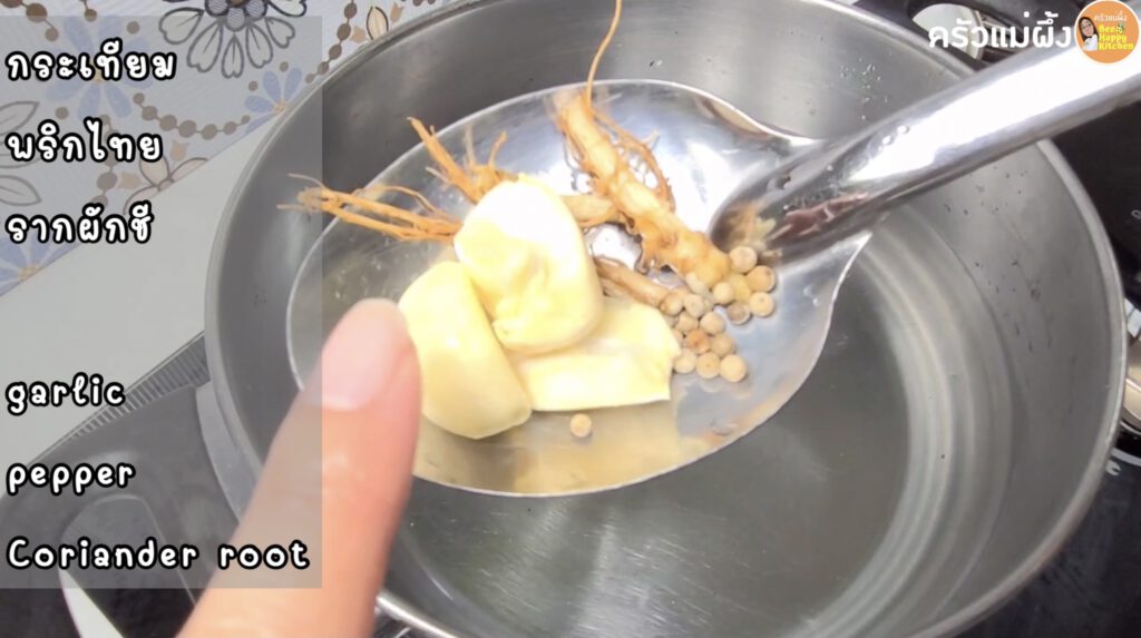 1.ใส่น้ำ 1.5 ลิตร+กระเทียมพริกไทย ร ากผักชี(เพิ่มหอม)