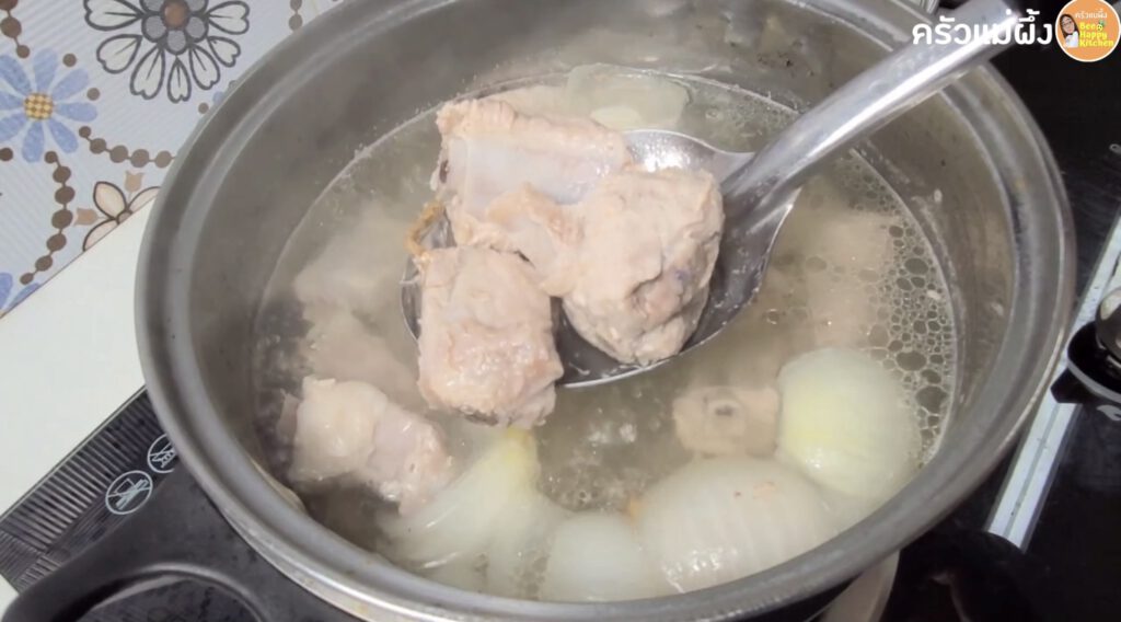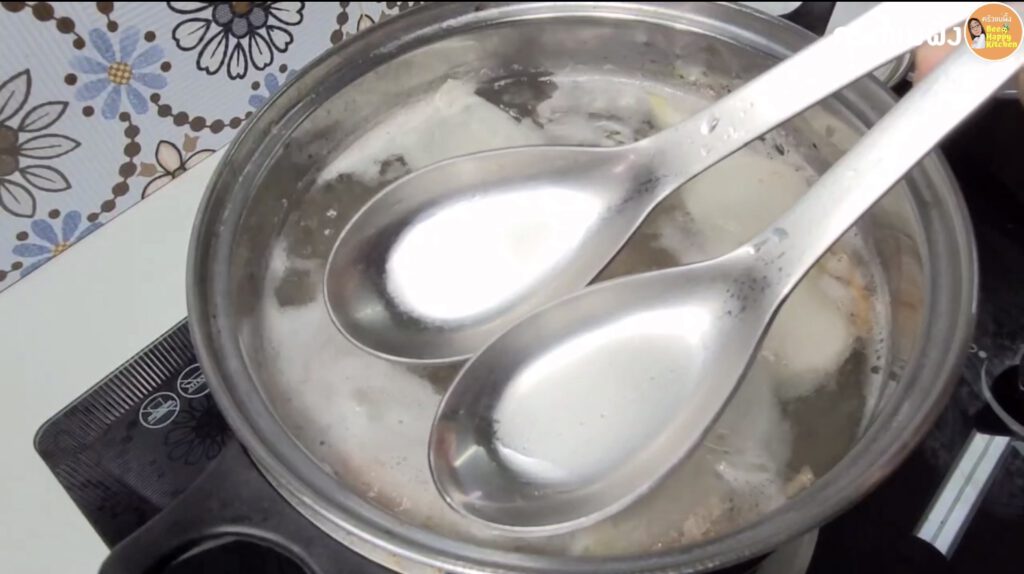 4.และเ ค ล็ ดลั บที่ช่วยทำให้กระดู กหมูเ ปื่ อ ยนุ่มไวมากๆ คือใส่ช้อนสแตนเลสลงไป 2-3 คัน