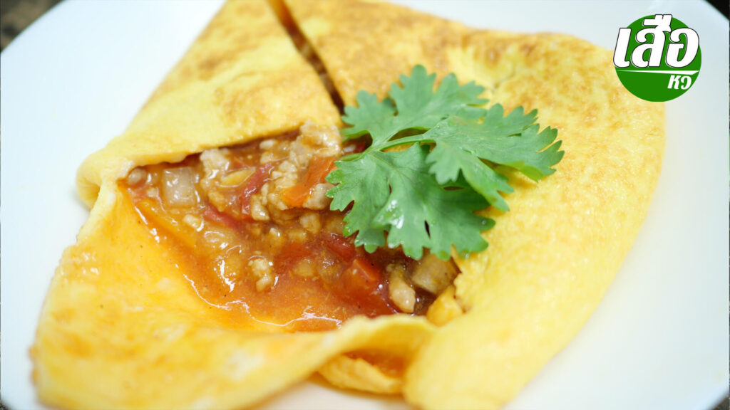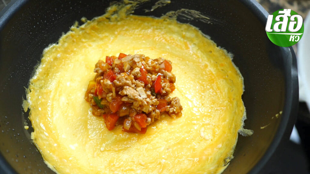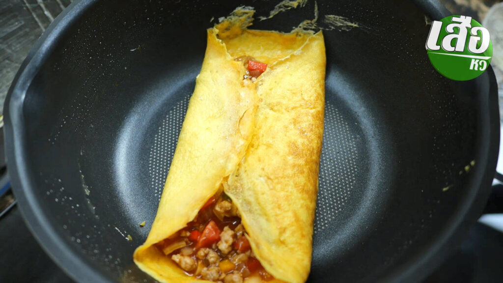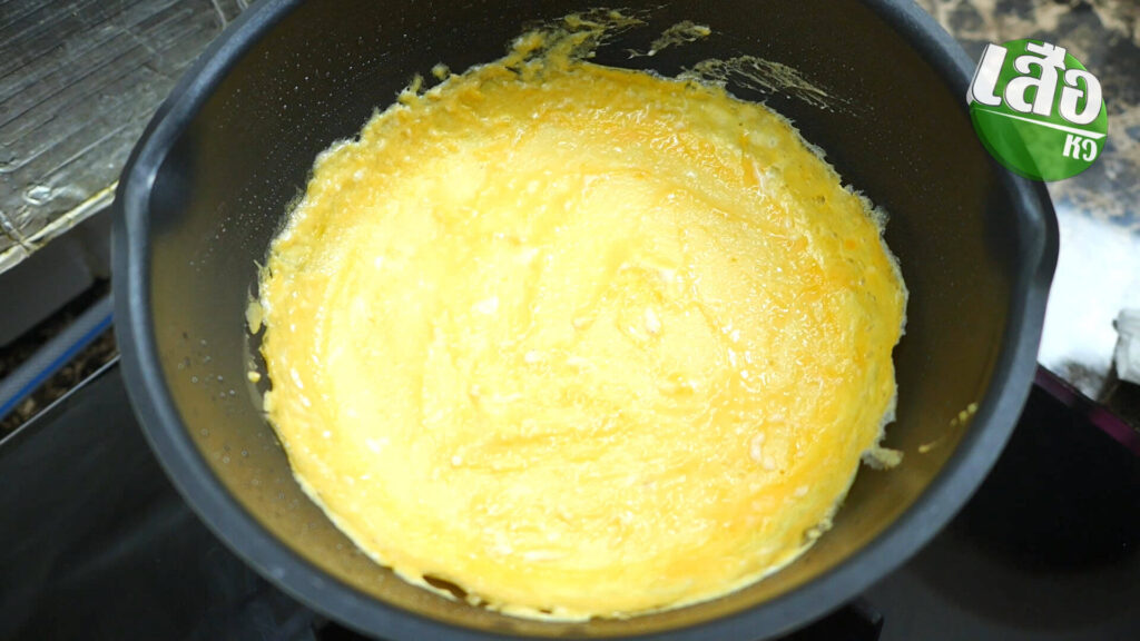 เพื่อให้ไข่ค่อย ๆ เซ็ตตัว ) และทำการยกกระทะกลิ้งไข่ไปให้ทั่วกระทะ เป็นวงกว้าง เพื่อให้ไข่มีขนาดใหญ่ เพื่อจะได้ห่อไ ส้ได้