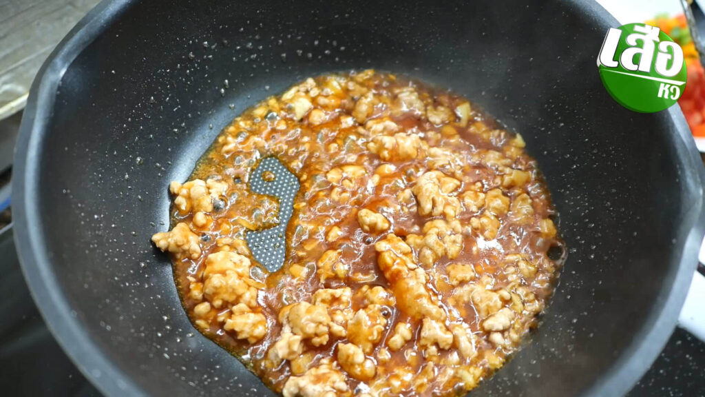 ใส่เ นื้ อหมู บ ดที่เราเตรียมไว้ลงไปผัดให้สุ ก