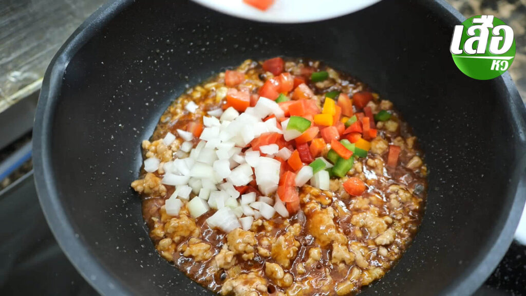 3. เมื่อได้รสช าติตามที่ต้องการแล้ว เราจะใส่ผักที่เตรียมไว้ หอมหัวใหญ่ มะเขือเทศ พริกหวานสามสี ลงไปผัดให้สุ ก