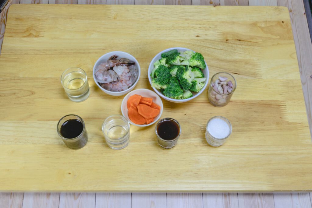 1.ล้างทำความสะอาดกุ้งไว้รอ ล้างและหั่นบล็อคโคลี่กับแครอทไว้ให้พร้อม