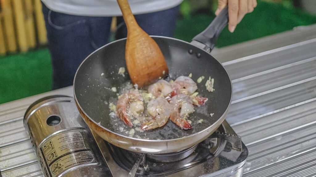 2.นำกระทะตั้งไ ฟใส่น้ำมันให้ร้ อ น ตามด้วยกระเทียมบุ บลงผัดให้หอม