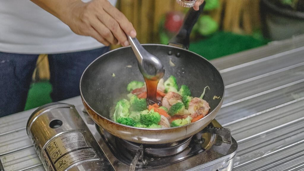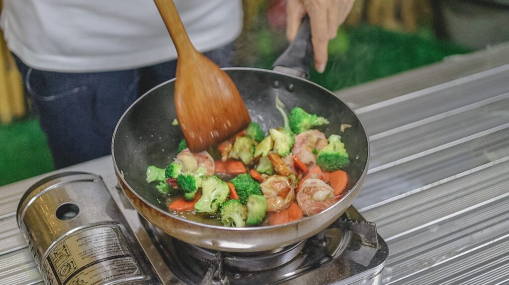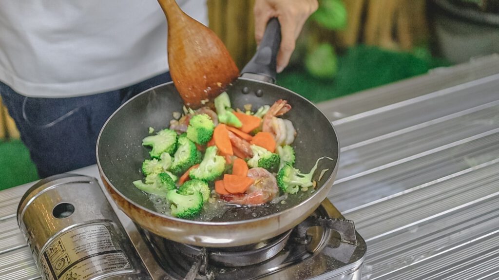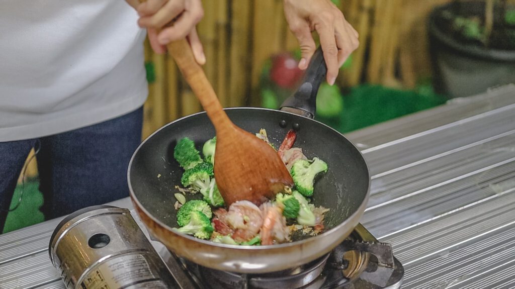 3.ใส่กุ้งลงไปผัด พอกุ้งเริ่มสุ กจึงใส่บล็อคโคลี่ตามลงไปผัดให้ทั่ว