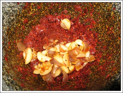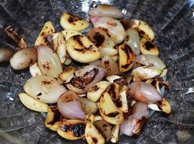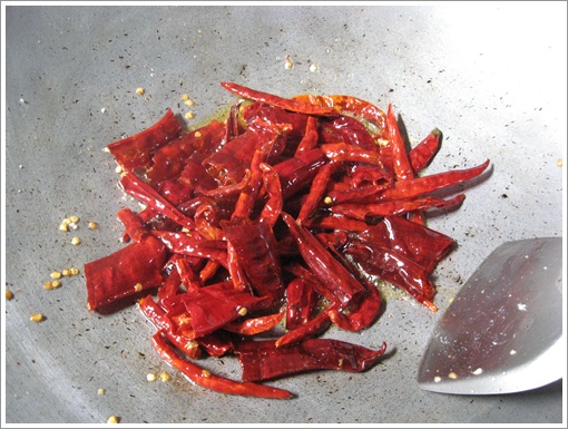 1. ใส่น้ำมันลงไปในกระทะ 1 ช้อนโต๊ะ เด็ดขั้วพริกออก ลงนำไปคั่ วให้หอม คั่ วให้ได้สีออกดำๆแดงๆ ตักออกคะพักไว้