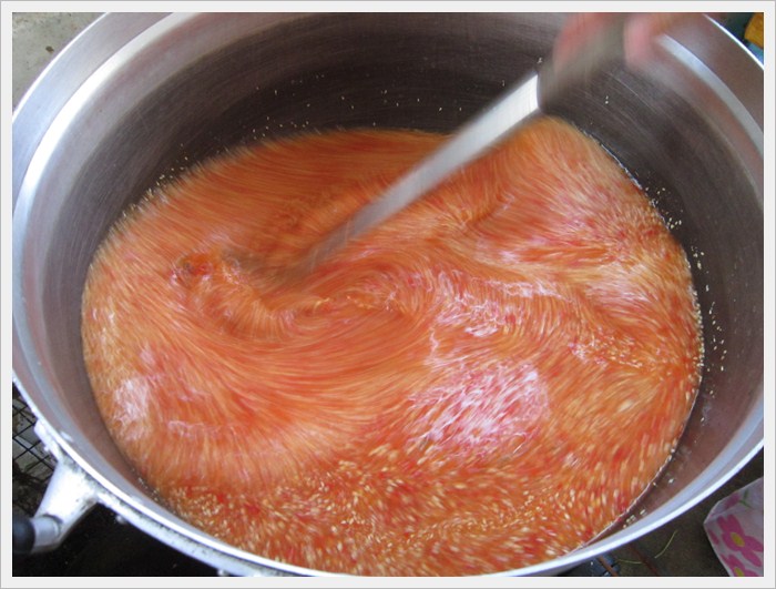 เพื่อล้างความเผ็ดออกให้หมด ค่อยๆล้างออกโดยใช้กระชอนเป็นตัวร่ อ น ล้างพริกไปเรื่อยๆจนหมด เราก็จะได้พริกสีสัน