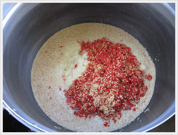 8. ตามด้วยซอสพริก แล้วก็คนให้ส่วนผสมเข้ากัน