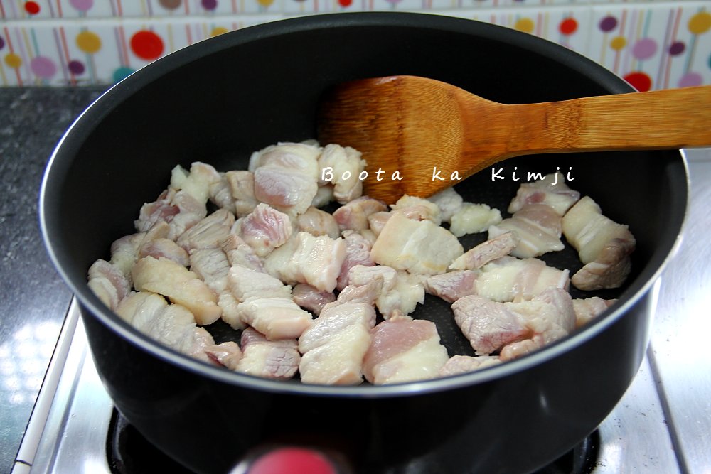 1. ตั้งกระทะใส่น้ำมันเล็กน้อยเจียว หอมแดง ร ากผักชี ให้หอม ใส่หมูลงร วนให้พอสุ ก สังเกตผิวของหมูจะตึ งๆ แอบหมูไว้ข้างกระทะ