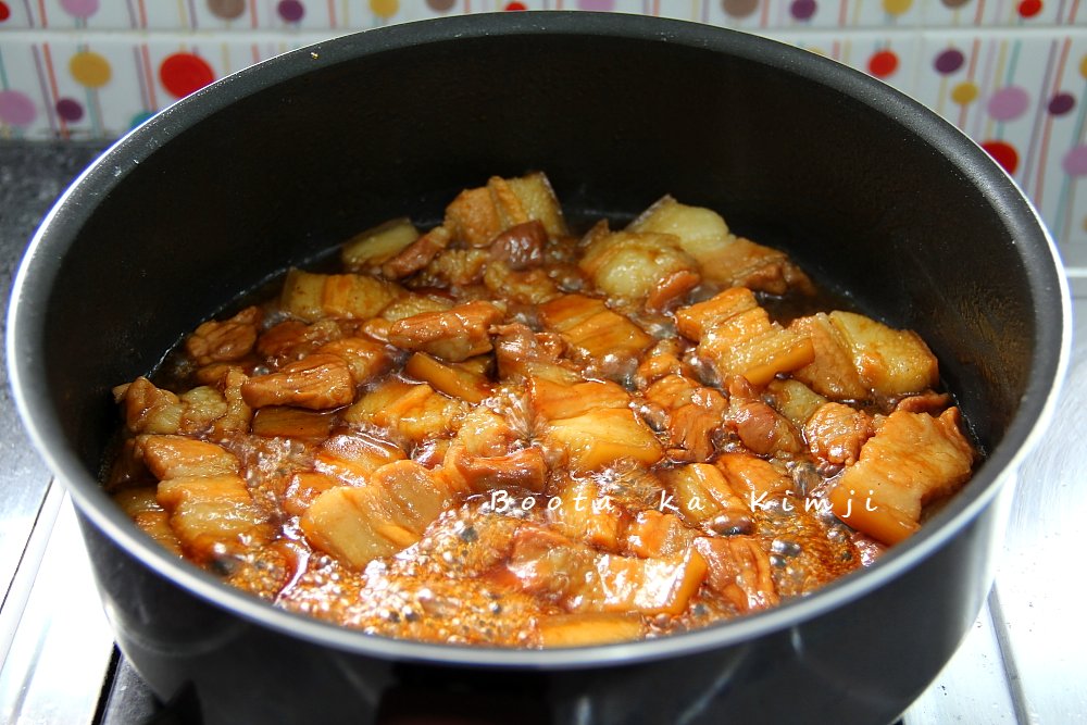 คลุกเคล้าเ คี่ ย วกับน้ำเชื่อมจนหมูสุ ก ถ้าสีไม่เข้มเติมซีอิ๊วดำลงไปเพื่อความสวยงามน่ากิน