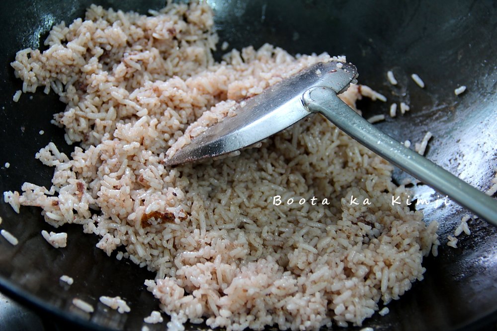 2. ใส่ข้าวสวยลงผัดคลุกเคล้าให้เข้ากัน ผัดจนกะปิเคลือบข้าวเป็นสีเดียวกันแล้ว