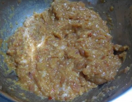 – ผสมหมูสั บ พริกแกง ถั่วลิสงคั่ว ไข่ น้ำกะทิ น้ำตาล ด อ กเกลือ คนส่วนผสมให้เข้ากัน นำไปยั ดใส่ไ ส้