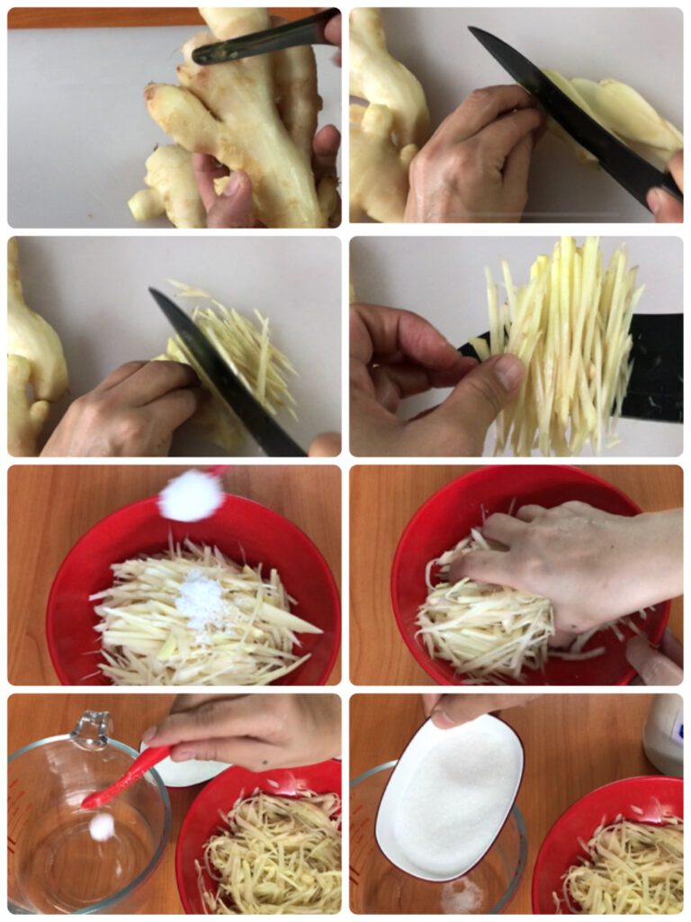 – นำขิ งมาปอกเปลือกหรือขู ดเปลือกออก ล้างและหั่นเป็นเส้น
