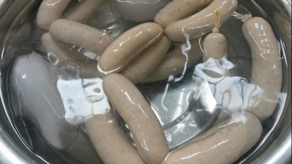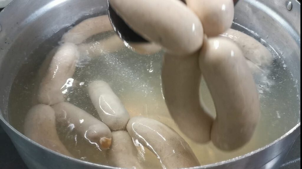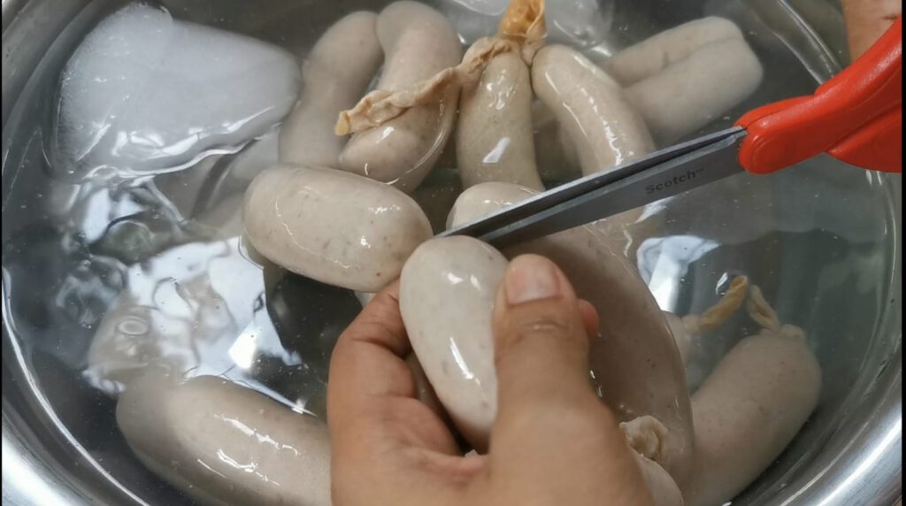 5.ตั้งน้ำให้ ร้ อ นแต่ไม่เ ดื อ ด ใส่ไ ส้กรอกลงไปต้ม 30 นาที ตักขึ้นใส่ลงในน้ำเย็นจัด