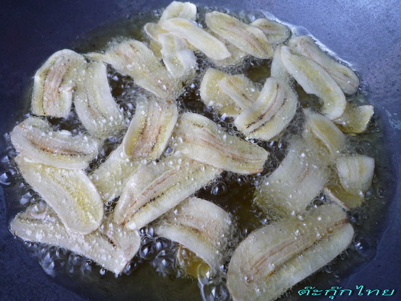 แต่ถ้าแรงไป กล้วยจะไหม้ก่อน แล้วข้างในจะนิ่ม ข้อสังเกตุว่า กล้วยได้รึยังอีกอย่ างนึงคือ ฟองน้ำมันในกระทะเริ่มน้อยลง