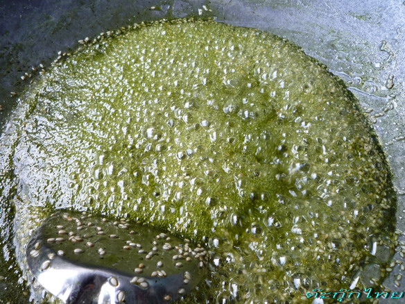 แล้วก็ใส่ง าที่เราคั่ วลงไปได้เลย คนไปเรื่อยๆ ฟองอากาศเริ่มถี่ขึ้น