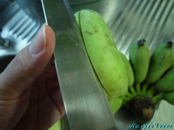 พย าย ามอย่ าให้มี ดโดนเ นื้ อกล้วย แล้วก็ค่อยๆ เอามือแกะเปลือกออกมา อาจจะยากซักนิดเพราะเป็นกล้วยดิ บ