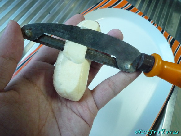 เอามี ดป าดที่หัวกับท้ายออกไปก่อนแล้วก็จัดการผ่ าที่หลังกล้วย เอามี ดก รี ดที่เปลือกลงไป