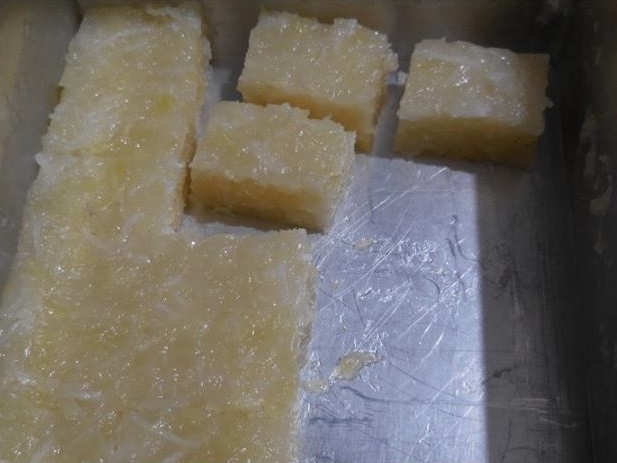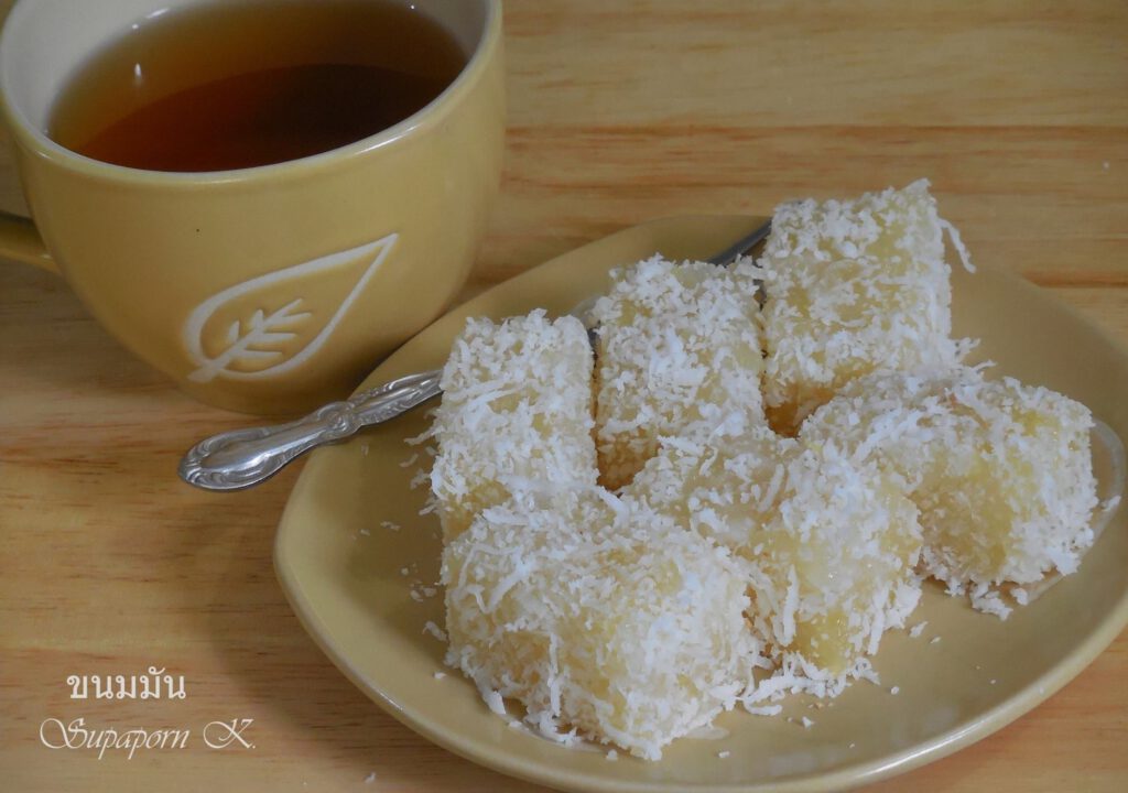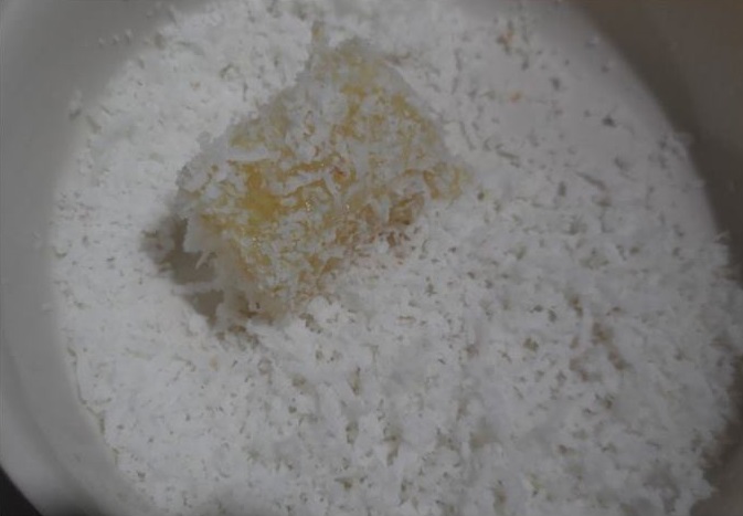– พอขนมเย็นตัวลง ตัดเป็นชิ้นเล็ก นำไปคลุกกับมะพร้าว แล้วจัดใส่จาน