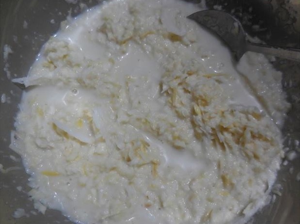 นวดให้ส่วนผสมเข้ากันดี แล้วใส่น้ำกะทิ คนส่วนผสมให้เข้ากัน