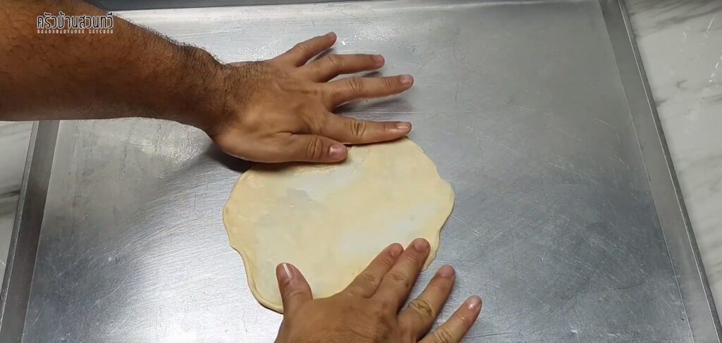 แล้วนำแป้งมาฟ าดกับถาด หรือแผ่แป้งออกให้เป็นแผ่นบางๆ