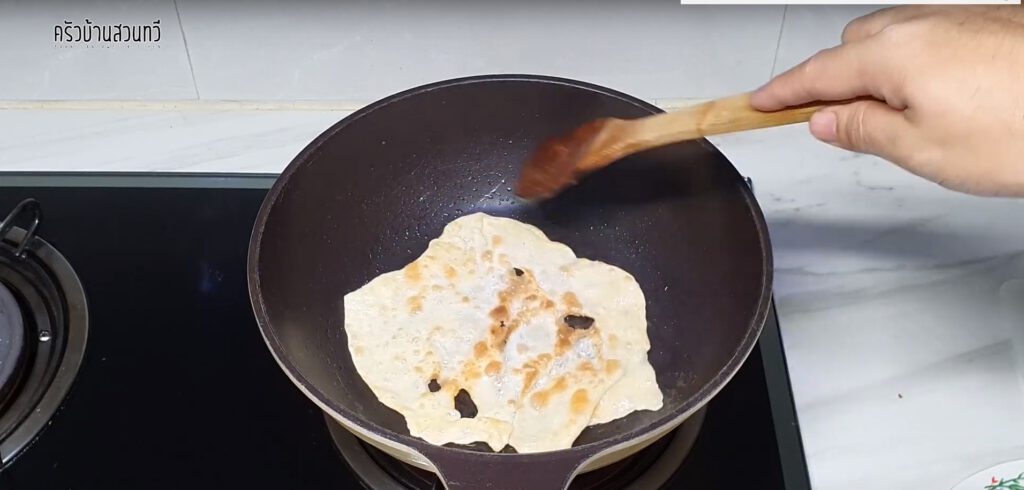 7. ตั้งกระทะใส่น้ำมัน ใช้ไ ฟปานกลาง จากนั้นนำแป้งโรตีลงทอดให้สุ ก เหลืองกรอบ ทั้ง 2 ด้าน