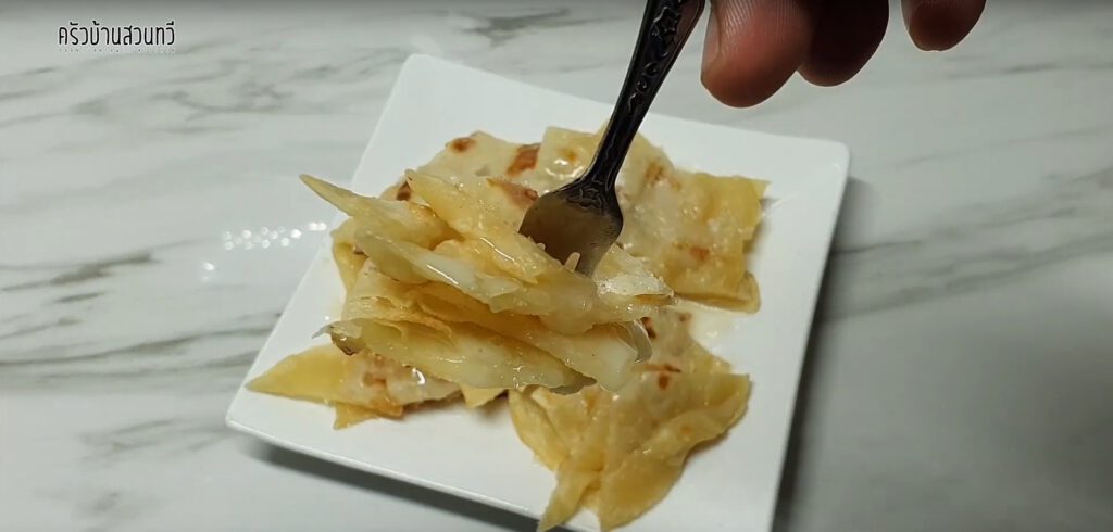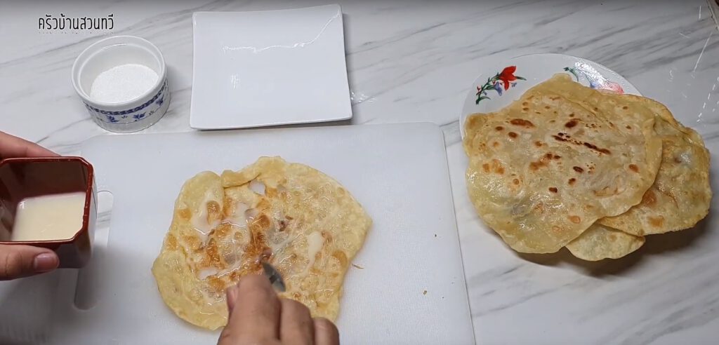 8. นำแป้งโรตีที่ทอด มาโรยด้วยนมข้นหวาน น้ำตาล แล้วตัดเป็นแผ่น หรือห่อกระดาษ