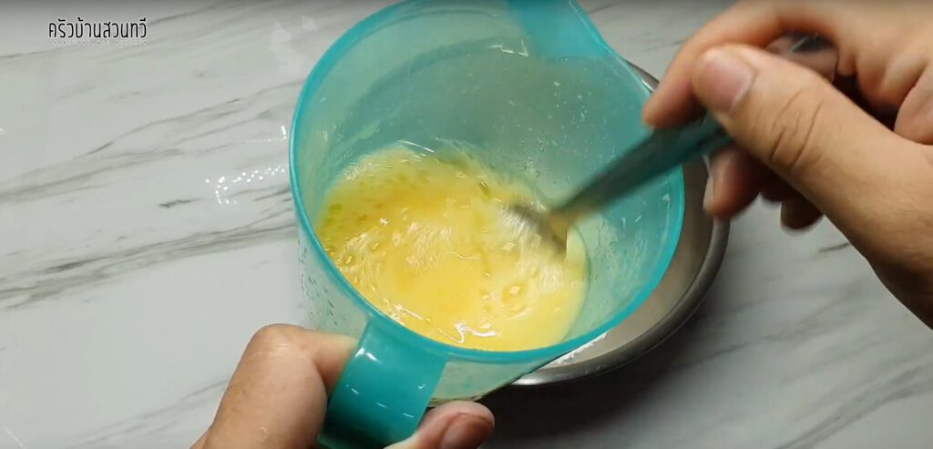 1. นำไข่ไก่ น้ำตาล เกลือ นม น้ำมัน น้ำเปล่า ใส่รวมกัน จากนั้นผสมให้เข้ากันให้น้ำตาลและเกลือ ละลายดี