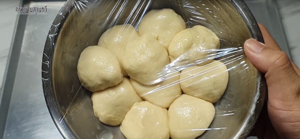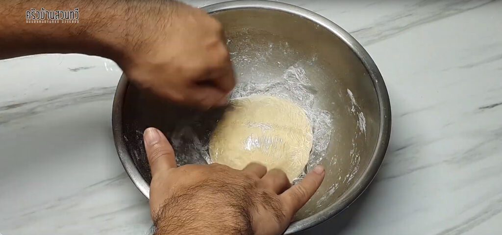 3. พักแป้งไว้ 10 นาที โดยหน้าผ้าหรือพลาสติกแรปคลุปแป้งไว้