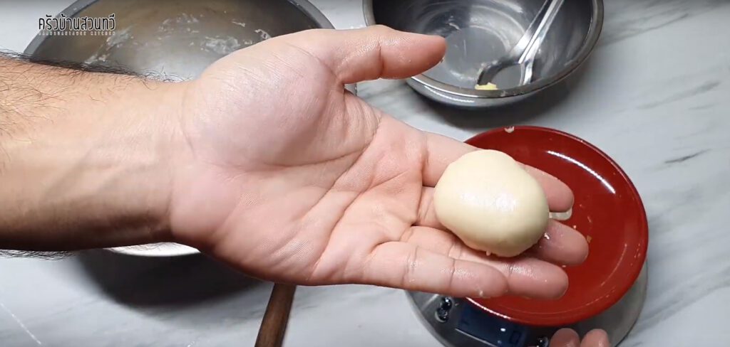 มาทาด้วยเนยให้ทั่วแล้วปั้นเป็นก้อนกลม จากนั้นพักแป้งไว้ 15-20 นาที