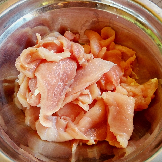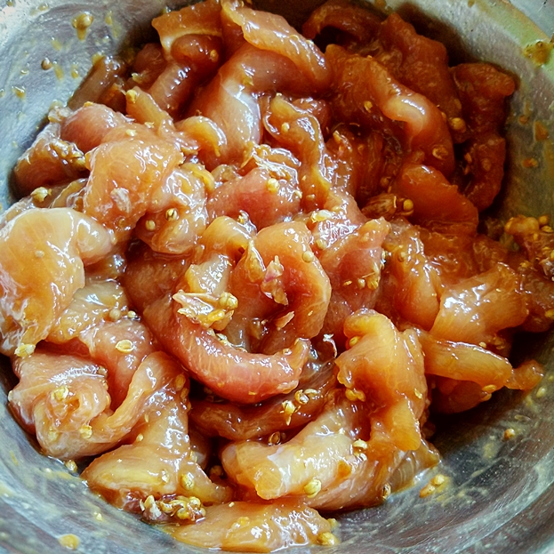 1.หั่นหมูเป็นชิ้นความหนาประมาณ 0.3 ซม