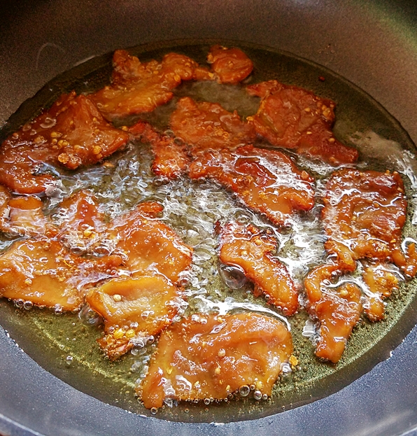 6.ตั้งกระทะใส่น้ำมันพอประมาณ ใช้ไ ฟอ่อนๆนะคะ เพราะหมูจะไ ห ม้เร็วมาก พอน้ำมันเริ่มเ ดื อ ดก็ใส่หมูลงไป