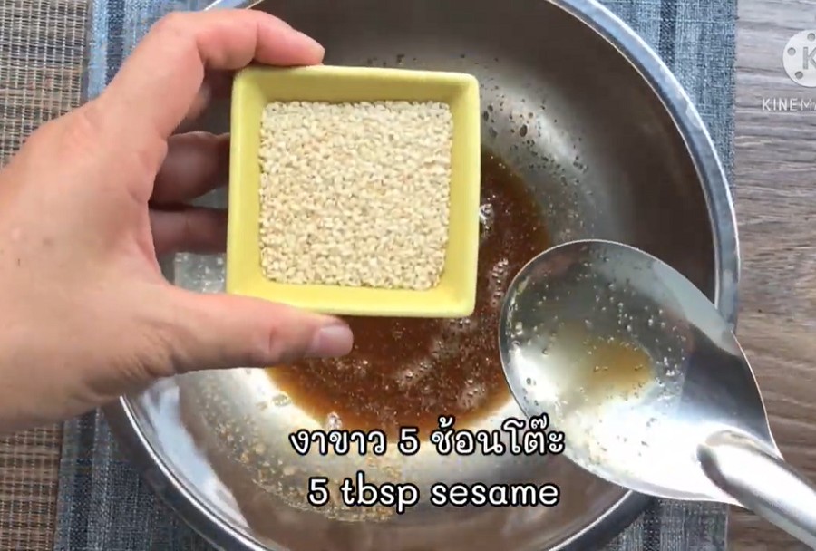 3. ใส่พริกไทย ง าขาว คนคลุกเคล้าให้เข้ากัน