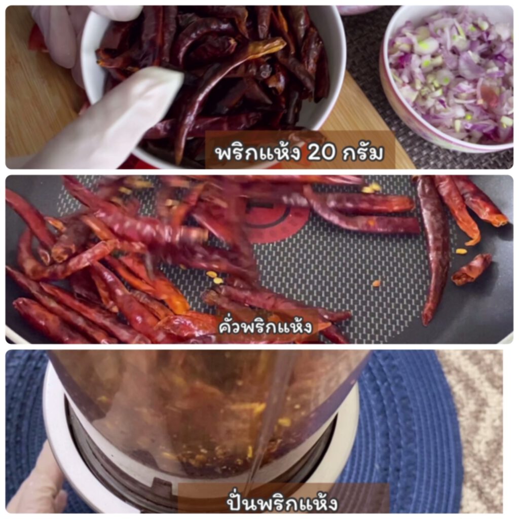 – พริกแห้งคั่ ว 20 กรัม (ความเผ็ด ลด-เพิ่ม ตามชอบ)