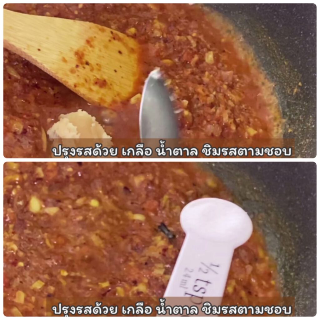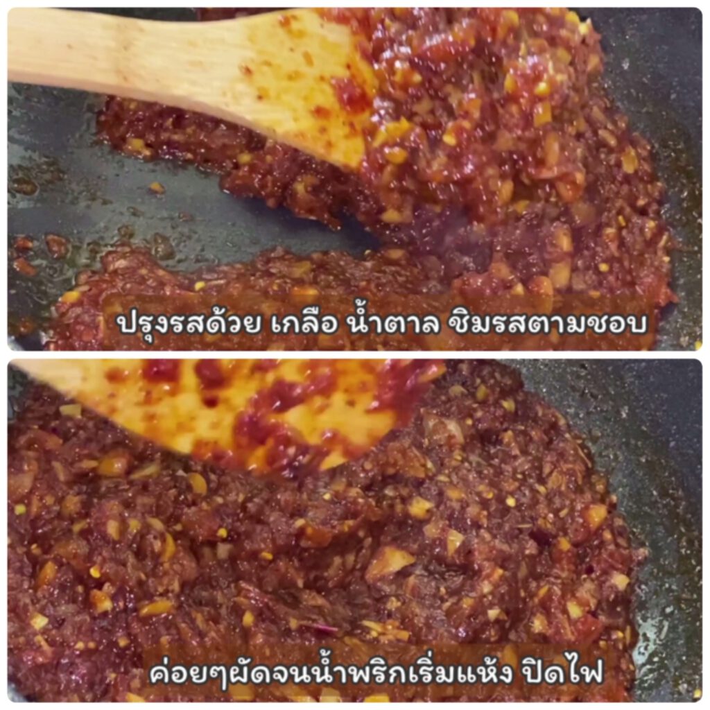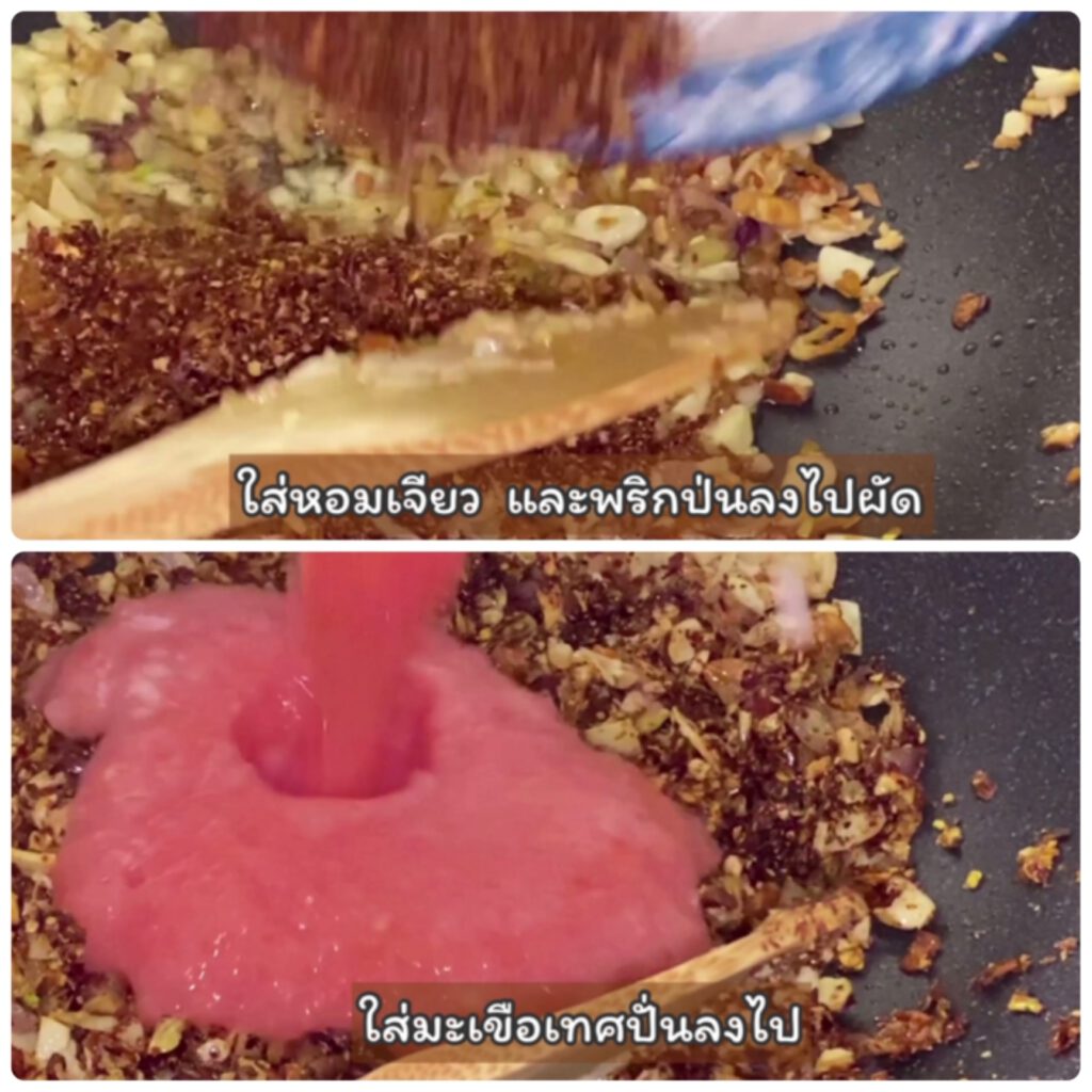 4. ตั้งกระทะ ใส่หอมเจียว กระเทียมเจียว และพริกป่น และมะเขือเทศที่ปั่น ลงไปผัดรวมกันเลยค่ะ. ใช้ไ ฟอ่อนๆค่อย ผัด
